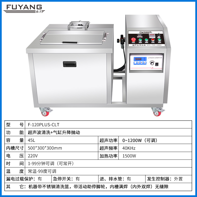 F-120PLUS-CLT | 45L 1200W 单槽带气缸升降抛动超声波清洗机