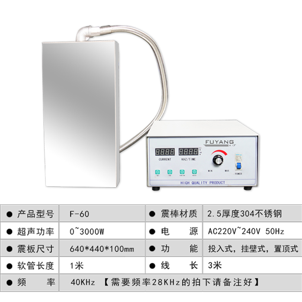 超声波震板、发生器、发生器电源、说明书、合格证保修卡、内置珍珠泡沫。